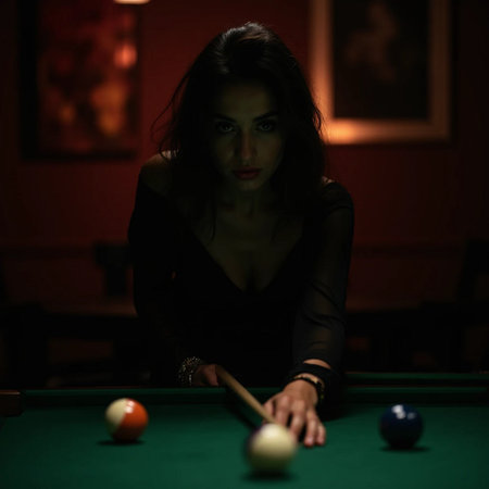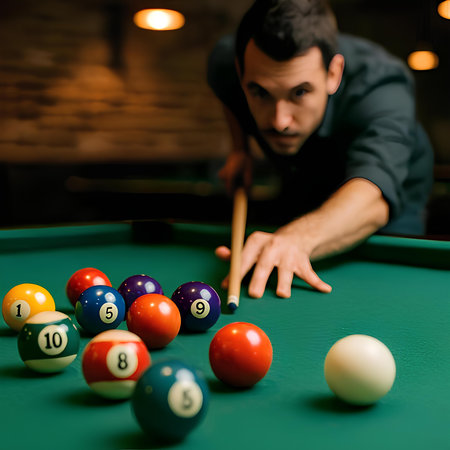 A portrait of intense focus, captured in a cinematic pool hall setting The player's gaze is locked on the cue ball, highlighting the strategic nature of the game Dynamic lighting and sharp details emphasize the competitive spirit and the player's unwavering concentration AI Generative