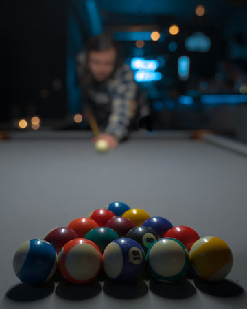 Player prepares to breaks a pyramid in billiards. Nightlife. Billiard room on the background. Above view.