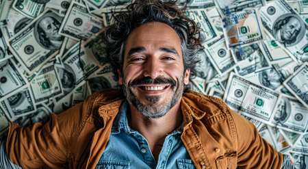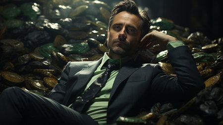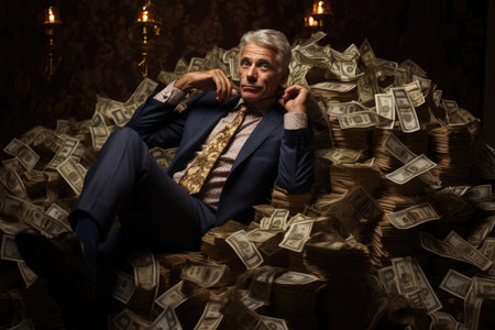 Billionaire on Huge Pile of Banknotes Rich and Prosperity Comeliness