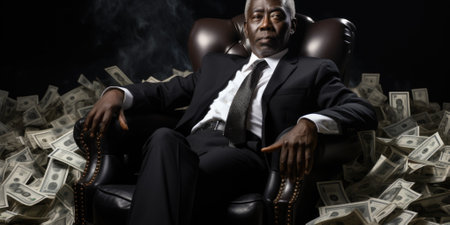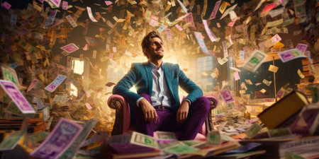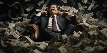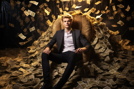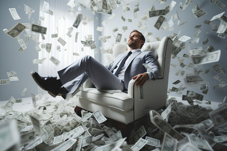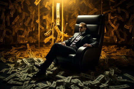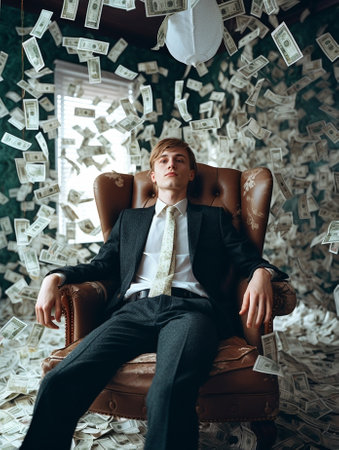 A businessman sits in a leather chair surrounded by stacks of money and falling dollar bills