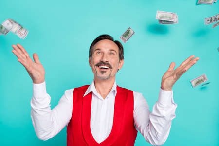 Photo of excited cheerful handsome man enjoy fall money rich look empty space isolated over teal color background