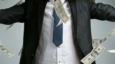 Happy person getting bonus money and banknotes flying in the air and get lucky rich and financial freedom comeliness