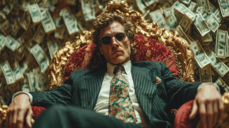 Powerful businessman in a suit and sunglasses sits confidently on a golden throne, surrounded by falling US dollar bills.