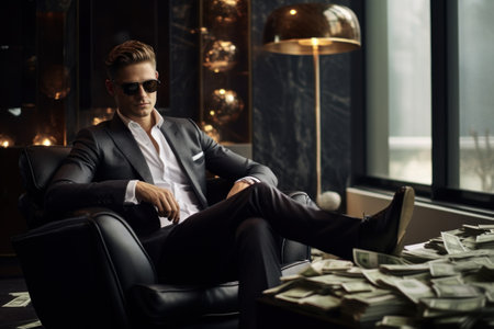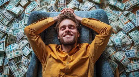 A man reclines on a leather sofa, surrounded by scattered dollar bills, exuding a sense of leisure and financial success.