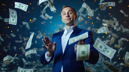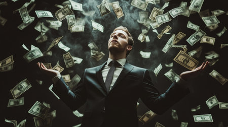 Young businessman surrounded by floating dollar bills, symbolizing wealth, success, and financial prosperity in the corporate and entrepreneurial world.