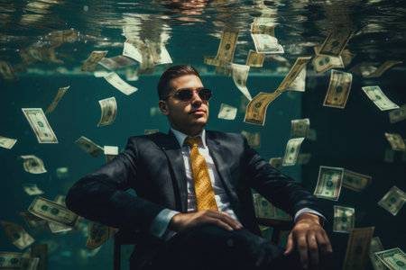 Businessman wearing suit drowning underwater with dollar banknotes. Bossy man diving in swimming pool. Concept of bankruptcy and problems in business.
