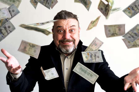 Happy bearded man in a suit, with dollar bills falling around him. Success. Finance. Profit.