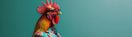 Rooster in floral suit and glasses, teal background, quirky portrait