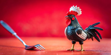 Chef Rooster: Tilt-Shift Miniature Black Rooster Chef Cooking Funny Food Stock Photo