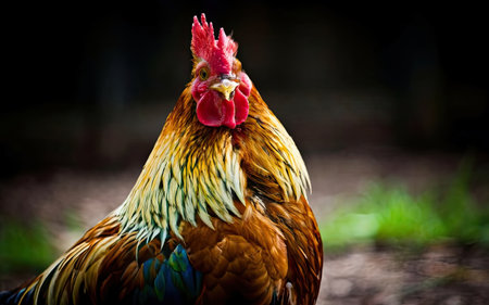 This close-up view showcases a vibrant rooster standing prominently against a dark black backdrop. The roosters colorful feathers and distinctive comb are in sharp focus, highlighting its striking appearance.