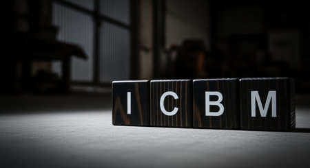 Four dark wooden blocks spelling ICBM, representing intercontinental ballistic missile, global threat, and security issues.