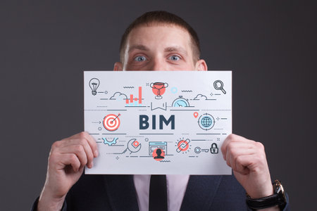 Business, Technology, Internet and network concept. Young businessman working on a virtual screen of the future and sees the inscription: BIM