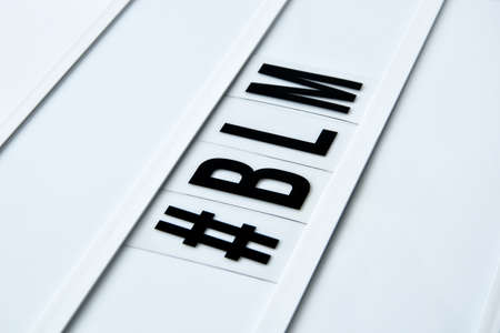 hashtag BLM BLACK LIVES MATTER text on a white background. Protest against the end of racism, anti-racism, equality. Poster on violation of human rights