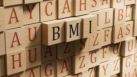 Cubes form the expression BMI (Body Mass Index).3D rendering on wooden background.