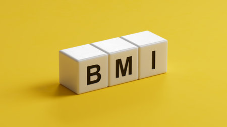 Cubes form the expression BMI (Body Mass Index).3D rendering on yellow background.