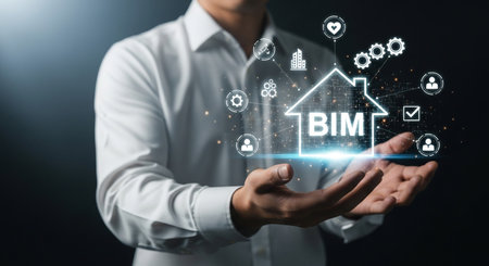 BIM Building Information Modeling Technology Concept. A professional interacts with BIM tech icons, 3D modeling, architecture planning, AI, project collaboration, software, smart construction elements
