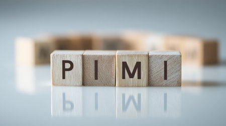 Wooden blocks forming the word PIMI on a reflective surface with a soft blurred background highlighting creativity and playful learning concepts
