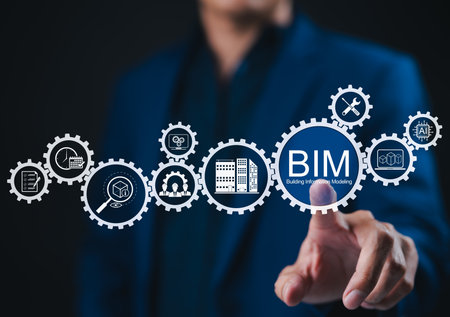 Building Information Modeling (BIM) Technology for Construction Projects. A professional working with BIM icons, tech used in construction, architecture, planning, management, increased efficiency,