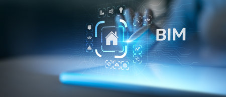 BIM Building Information Modeling and Digital Construction Management Illustrated on Virtual Interface.