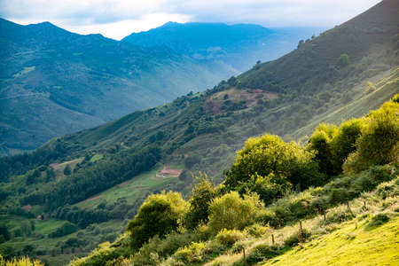 Landscape of a green valley in spring with some snow on the peaks during a sunny day in northern Spain. Relating to tourism, travel and hiking