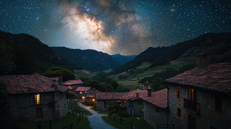 A serene village with charming stone houses is illuminated under a starry sky. The Milky Way glows brightly above the lush green mountains, creating a magical atmosphere.