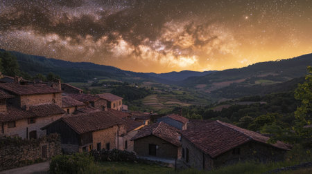 The picturesque village nestled in the mountains reveals a breathtaking night sky filled with stars and a warm glow from the setting sun. The peaceful landscape invites tranquility.