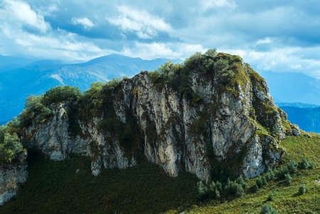 beautiful wooded rocky cliff against the backdrop of a mountain landscape