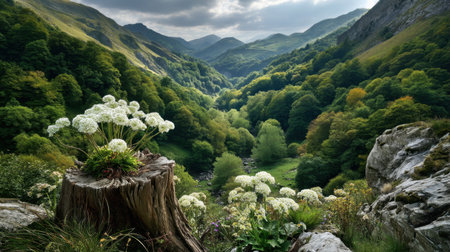 A breathtaking view of a serene mountain valley adorned with blooming wildflowers and rich greenery under a dramatic sky, showcasing nature's beauty.