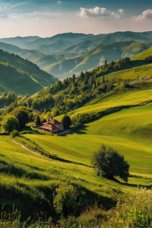 Scenic hills display fresh greenery in springtime under a pastel sky, showing the beauty of nature in a rural landscape.