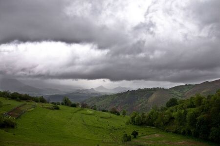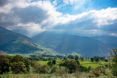 Cloudy sky and rays of light falling on the mountains of the valleys of Pas in Vega de Pas (Cantabria-Spain)2