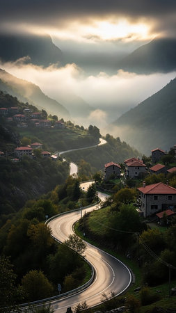 A winding road descends into a misty mountain valley filled with small villages and trees, illuminated by soft, diffused light.