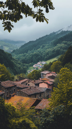The medieval village of Taramundi reveals its charm with stone houses surrounded by vibrant forests and hills under a soft, cloudy sky. This landscape captures Asturias' timeless beauty.