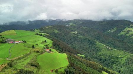Aerial view of a typical town in Saja Valley, Cantabria, Spain