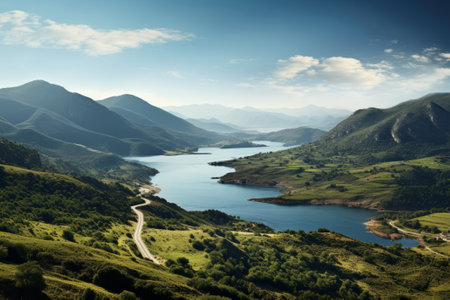 An AI generated illustration of A picturesque rural road is winding along the side of a mountain, providing a stunning view of the natural landscape