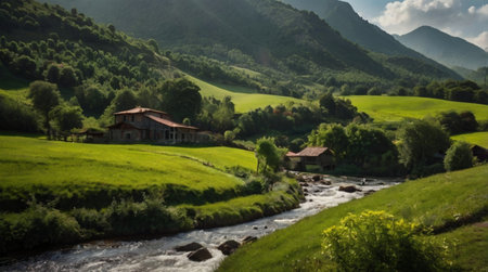 Rustic stone house with red tiled roof surrounded by lush green trees and mountain slopes, set in a peaceful rural landscape under clear summer sunlight; telephoto shot