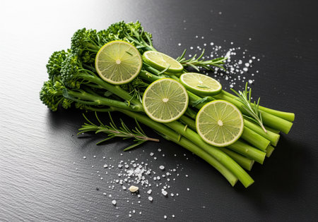 Vibrant green broccolini stalks are presented with fresh lime slices, aromatic rosemary, and coarse sea salt, perfect for healthy cooking concepts.