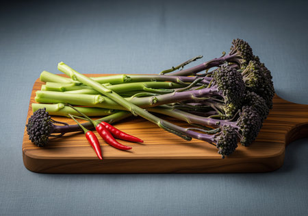 Fresh purple sprouting broccoli and vibrant green broccoli stems arranged with three bright red chili peppers on a rustic wooden cutting board, ready for cooking healthy meals.