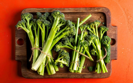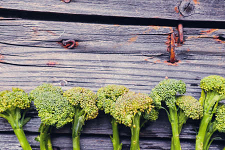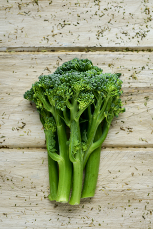 Raw broccolini green vegetable on wooden board. Healthy organic food, top view