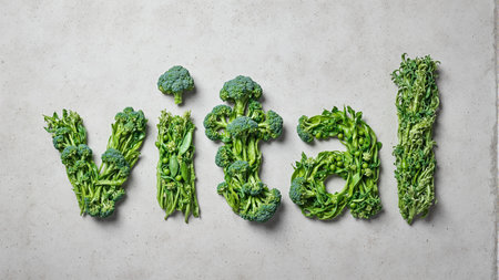 Fresh green veggies spell vital on gray surface