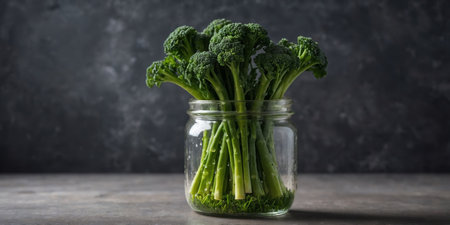AI Generated. Fresh Broccolini Stalks in a Water-Filled Glass Jar