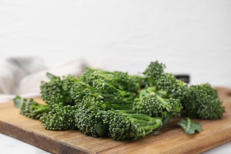 Fresh raw broccolini on wooden board, closeup. Healthy food