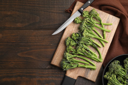 Fresh raw broccolini and knife on wooden table, flat lay with space for text. Healthy food