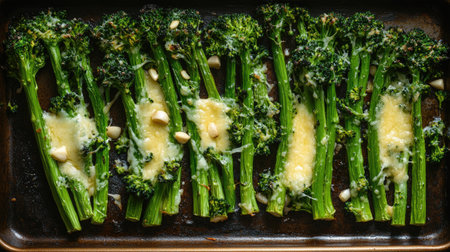 Close-up of roasted broccolini with melted cheese and garlic on a baking tray, viewed from above. Ideal for food bloggers and recipe collections.