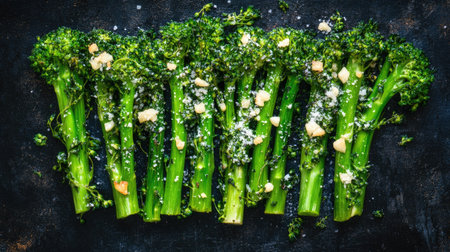 Roasted broccolini with garlic and cheese, plated beautifully on a dark background, viewed from above. A healthy side dish with gourmet appeal.