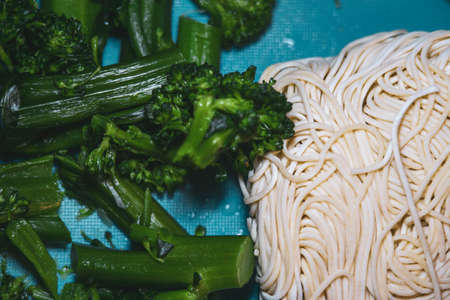Broccoli and Ramen Noodles on Blue Background