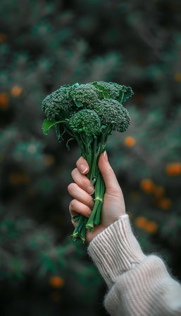 Hand with fresh, green organic broccolini