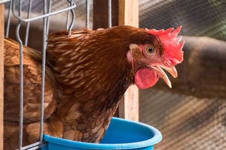 Chicken in the pen. A brown hen walks in an aviary on an autumn day on a farm.