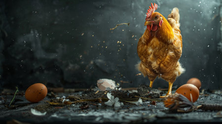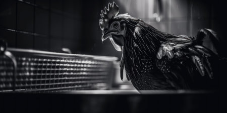 AI generated realistic hen standing in a rustic chicken coop with soft light filtering through the window highlighting its feathers. Natural shadows and textures enhance the cozy atmosphere.