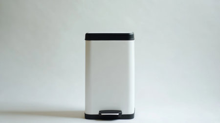 A sleek white and black trash bin stands on a light, subtle surface, creating a minimalist aesthetic suitable for modern interiors. An ideal image for design projects.