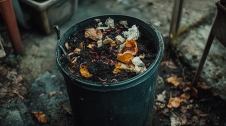 This image captures a compost bin filled with organic waste and red worms, highlighting the natural process of decomposition in an eco-friendly backyard setting.